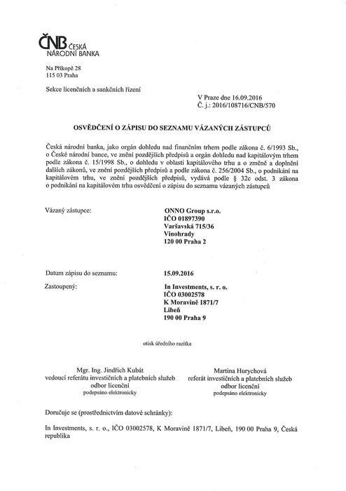 Společnost ONNO Group s.r.o. jejíž prostřednictvím podnikám v oblasti finančního zprostředkování a pojišťovnictví je vázaným zprostředkovatel: