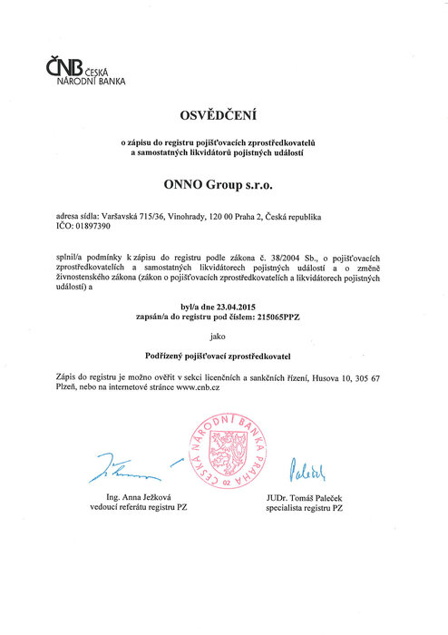 Společnost ONNO Group s.r.o. jejíž prostřednictvím podnikám v oblasti finančního zprostředkování a pojišťovnictví je vázaným zprostředkovatel: